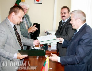 В минувшую субботу 21 июля в г.Аникщяй с целью формирования и развития дружеских отношений председатель Клецкого районного исполнительного комитета Анатолий Степанович Бойко и мэр самоуправления Аникщяйского района Сигутис Обелявичюс подписали протокол о намерении сотрудничества. Это стало возможным при непосредственном участии Посольства Республики Беларусь в Литве и личной поддержке Чрезвычайного и Полномочного Посла Республики Беларусь в Литовской Республике Владимира Нестеровича Дражина.