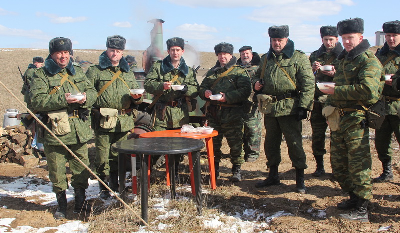 После стрельб у походной кухни всех ждали солдатская каша, уха и чай.