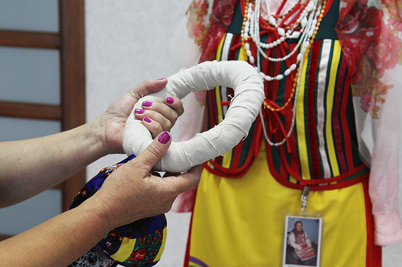 Долгое время не получалось добиться, чтобы она лежала на голове как нужно. Объем ей придает специальный “бублик” из скрученной пакли, обернутой льняным холстом. Он должен быть строго по размеру чепчика. А мы допускали ошибку в том, что делали его меньше. Это своеобразная имитация косы. Так, видимо, девушки слегка лукавили и демонстрировали парням богатство своих волос. Пока еще не знаем, как на данную деталь накручивались волосы. Ольга планирует предпринять отдельную экспедицию, чтобы выяснить это. Сверху на шапочку обязательно набрасывали платочек.