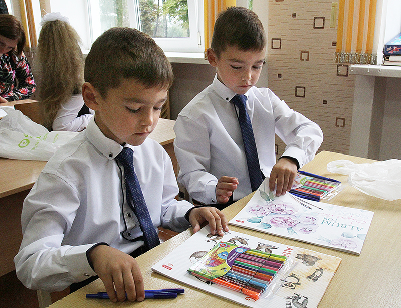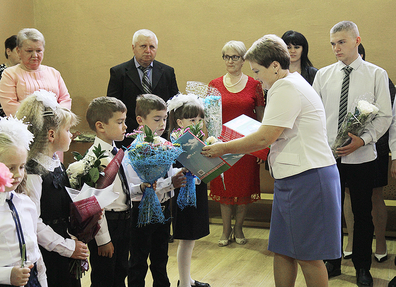…Вот он – торжественный волшебный миг: звонок – и ты уже ученик. Все они – 11 первоклашек сидят за партами. С интересом рассматривают подарки от старших товарищей, которые привели их за руку на школьный порог. Минута – и первая учительница Светлана Николаевна Чупак начинает первый урок по переданной директором школы Н.А.Авдей от Президента Республики Беларусь А.Г.Лукашенко каждому новоиспеченному школьнику страны книге «Мая Радзіма Беларусь».
