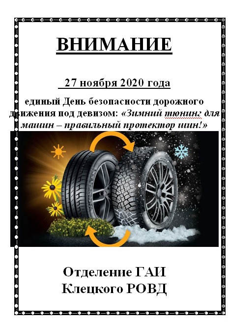 С целью профилактики и предупреждения ДТП в осенне-зимних условиях, а также подготовки автомобилей к эксплуатации в зимних условиях 27 ноября 2020 года Госавтоинспекция проводит единый День безопасности дорожного движения под девизом: «Зимний тюнинг для машин – правильный протектор шин!», а также профилактическую акцию под таким же названием с 25 ноября по 04 декабря 2020 года.
