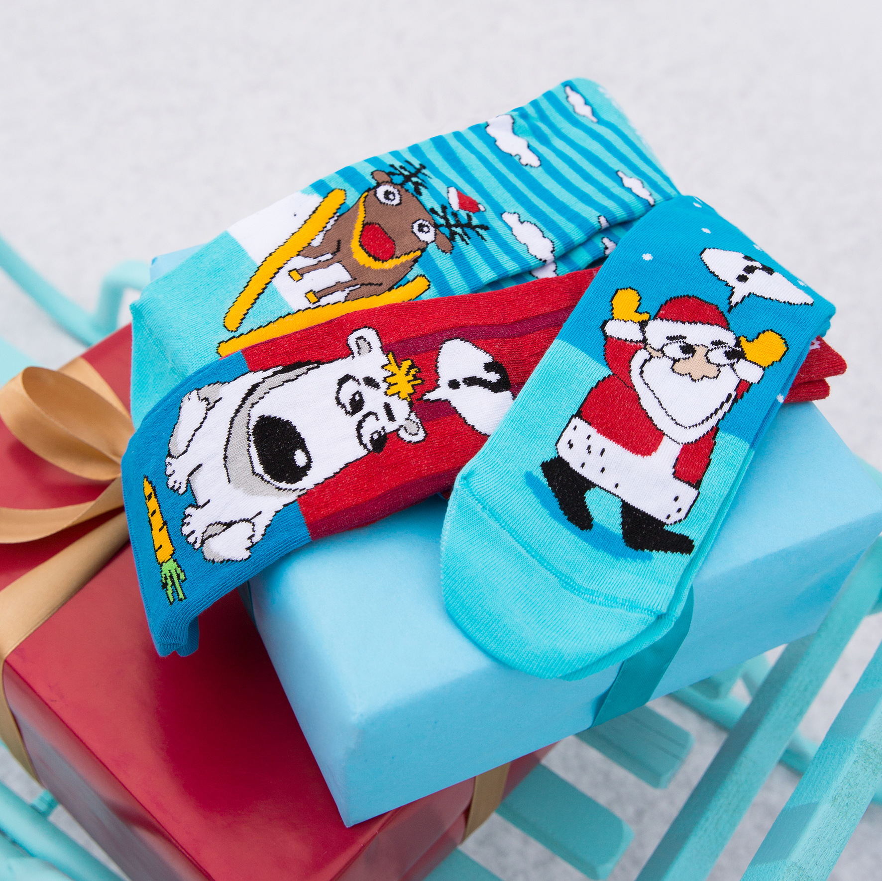 Дух праздников в новогодней коллекции MarkFormelle особенно подчеркивает коллекция новогодних носочков, среди которых есть и горячая новинка – унисекс-модели. Некоторые из них сразу упакованы в тематические подарочные коробочки. Ну а если ваш друг или знакомый является настоящим носочным коллекционером, можно купить в магазине целый чемодан носков, наполнив его любыми моделями на свой вкус.