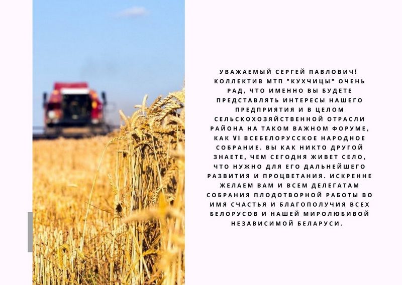 Накануне VI Всебелорусского народного собрания в адрес делегатов Клецкого района приходят слова пожелания плодотворной работы во время масштабного форума, который призван наметить направления дальнейшего развития нашего государства. Сегодня слова поддержки своему руководителю адресуют работники машинно-тракторного парка “Кухчицы”.