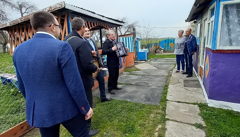 Хозяйка соседнего дома стояла на пороге, кутаясь в шаль от холодного ветра, и тоже ждала у себя музыкантов. Такую картину участники проекта в этот день видели часто. Это помогало забыть о том, что все они промокли, и вело их дальше по улицам Рубежа. Строгое мужское пение периодически разбавляли своими звонкими голосами Ирина Минец и Валентина Швайко из Морочского сельского клуба.