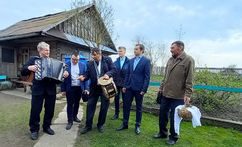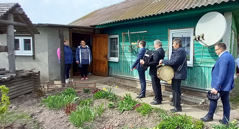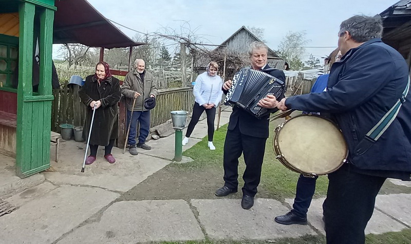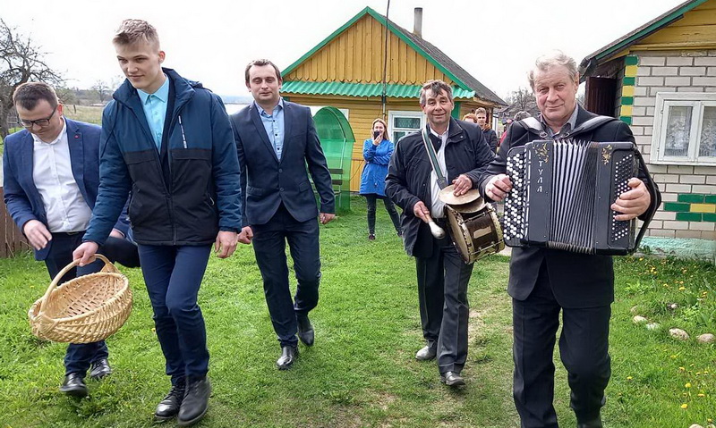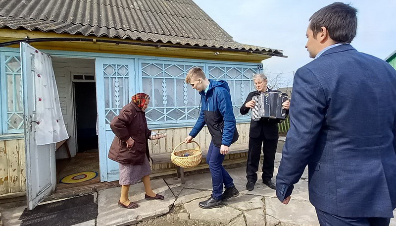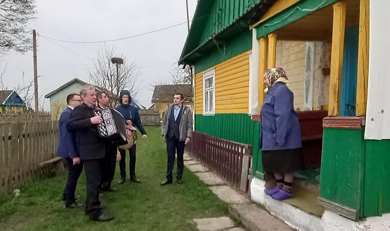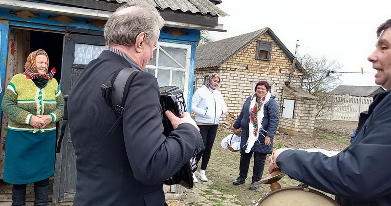 И «хлопцы» спели «Вялік святой нам дзень настаў», а затем – «Добры вечар вам пад аканэчко». Тексты этих песен Ольга Пилецкая записала, общаясь с жителем Рубежа Виктором Александровичем Коршуном. Прекрасные музыканты Владимир Снарский и Сергей Машко подобрали фольклорным текстам аранжировку для баяна и барабана. А другие участники им подпели. С каждым заходом в новый дом, получалось все лучше.