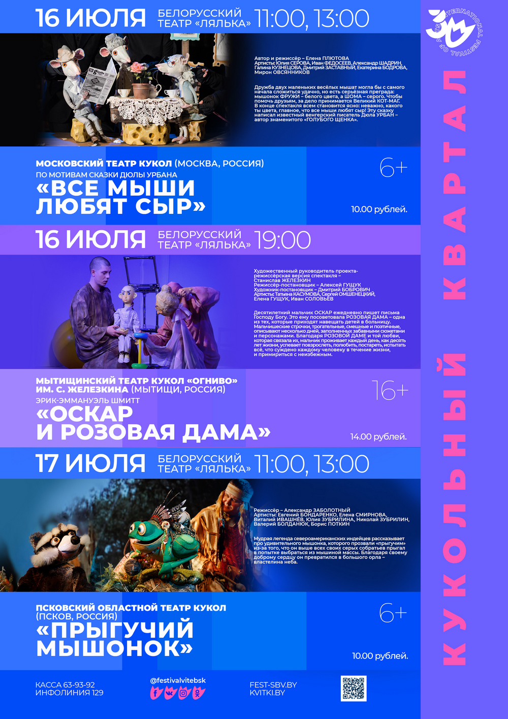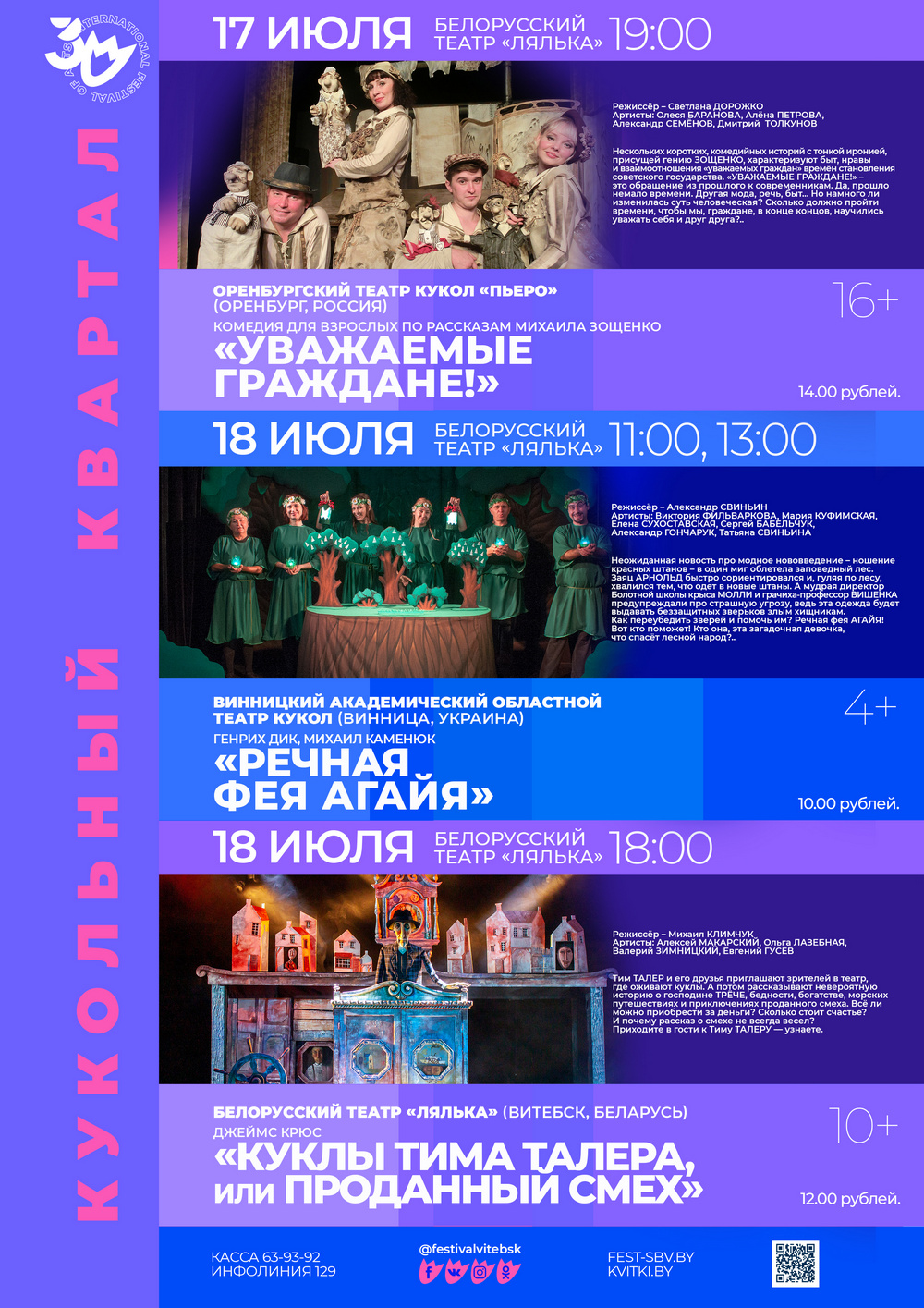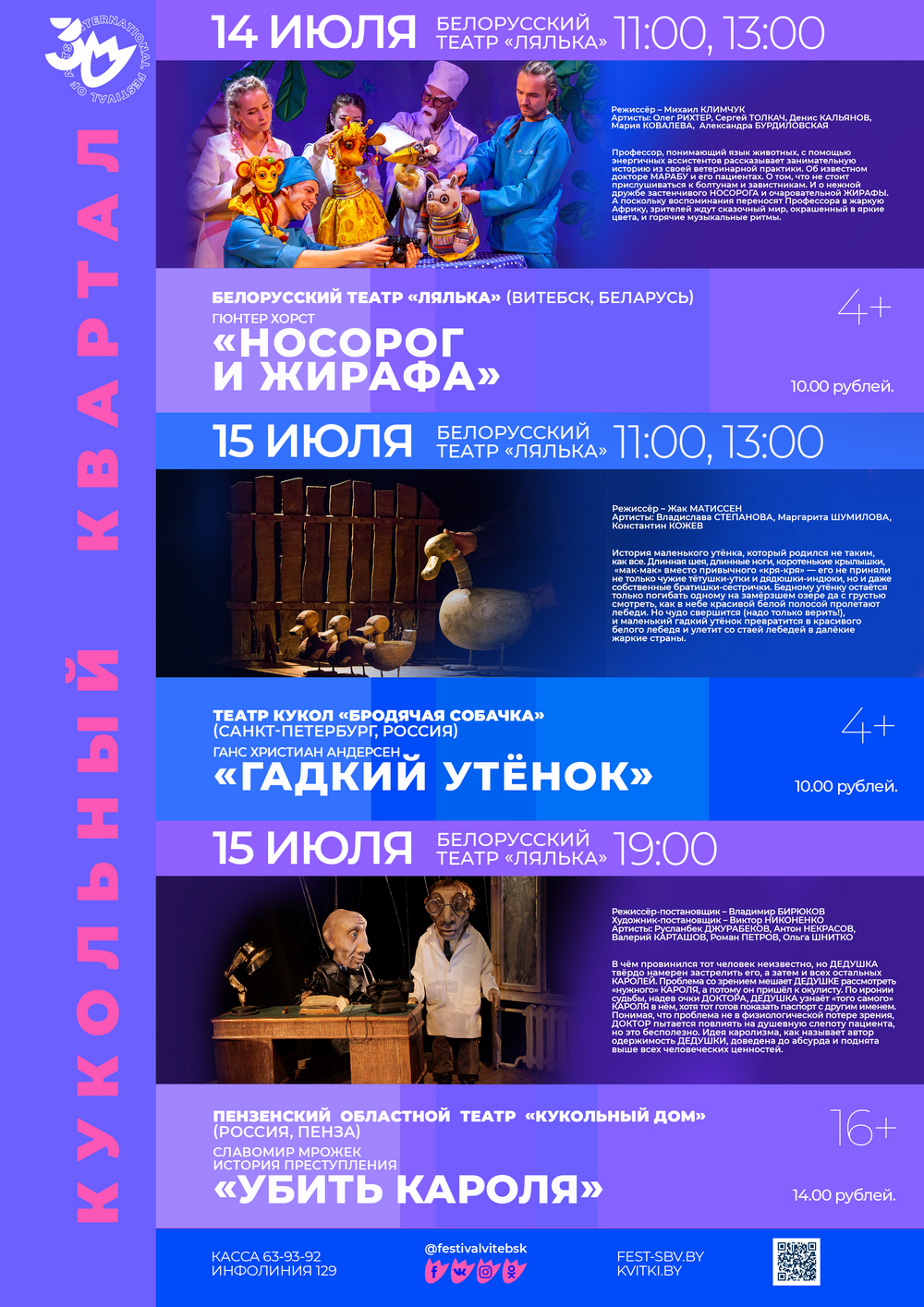 Белорусский театр «ЛЯЛЬКА» представит на своей сцене произведения для самых маленьких зрителей и их родителей в проекте «КУКОЛЬНЫЙ КВАРТАЛ». Помимо хозяев площадки ожидаются спектакли театра кукол «БРОДЯЧАЯ СОБАЧКА» (Санкт-Петербург, Россия), Пензенского областного театра «КУКОЛЬНЫЙ ДОМ» (Пенза, Россия), МОСКОВСКОГО ТЕАТРА КУКОЛ (Москва, Россия), Мытищинского театра кукол «ОГНИВО» имени С. ЖЕЛЕЗКИНА (Мытищи, Россия), Оренбургского театра кукол «ПЬЕРО» (Оренбург, Россия) и ВИННИЦКОГО АКАДЕМИЧЕСКОГО ОБЛАСТНОГО ТЕАТРА КУКОЛ (Винница, Украина).