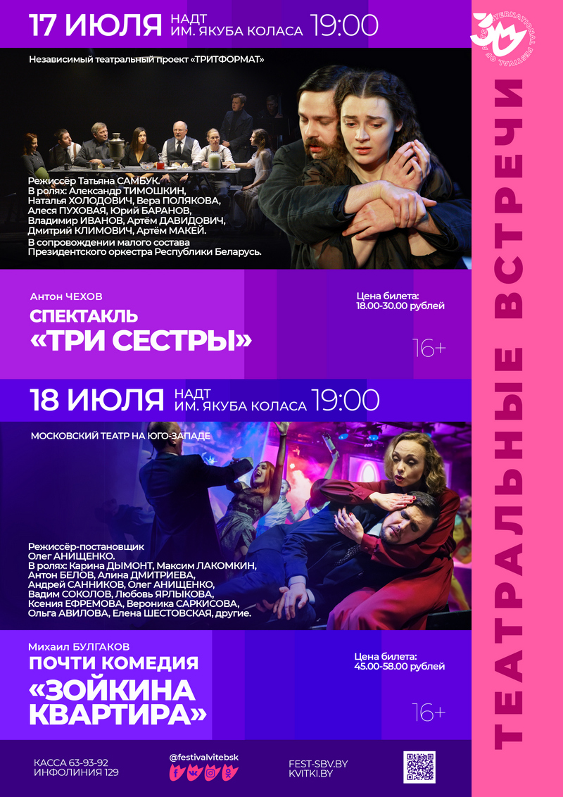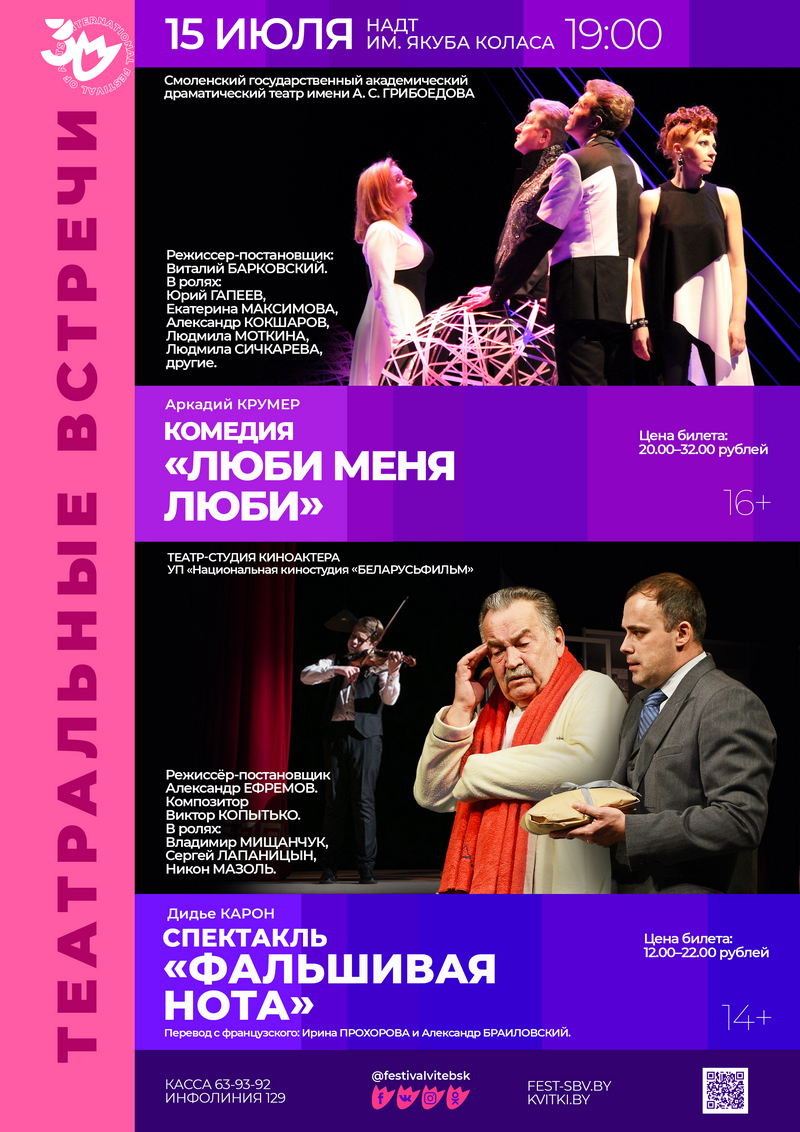 Национальный академический драматический театр имени Якуба КОЛАСА готовится встречать постановки Заслуженного коллектива Республики Беларусь «ТЕАТР-СТУДИЯ КИНОАКТЕРА УП «НАЦИОНАЛЬНАЯ КИНОСТУДИЯ «БЕЛАРУСЬФИЛЬМ», Независимого театрального проекта «ТРИТФОРМАТ» (Беларусь), Смоленского государственного драматического театра имени А.С. ГРИБОЕДОВА, МОСКОВСКОГО ТЕАТРА НА ЮГО-ЗАПАДЕ (Россия).