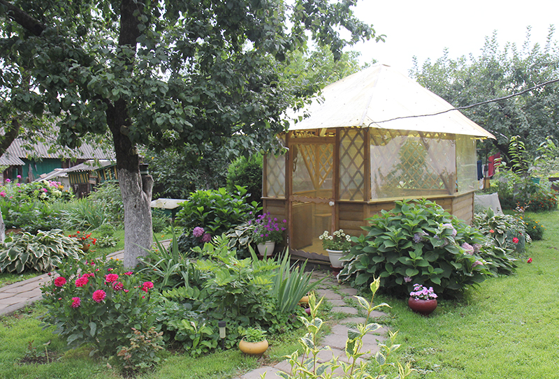 Пригодилась и старая ванна: неподалеку от входа ее вкопали в землю, наполнили водой и выращивают в ней нимфею – водяную лилию. Вокруг рукотворного озерца растут цветы. Их видовое разнообразие впечатляет! Очень гармонично, дополняя друг друга, соседствуют на клумбах малиновые, оранжевые, желтые георгины, ирисы, пионы, папоротники, астильба белая, розовая, бордовая, сальвии…