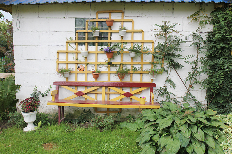 Правда, Анатолий Владимирович в подмогу растению соорудил и укрепил на стене решетку из планок, но такой же куст у веранды и без подпоры стремительно тянется вверх. А другой угол этого строения увивает… глициния. Ее длинные лавандовые соцветия просто зачаровывают! Чтобы наслаждаться этим чудом природы во время цветения, рядышком соорудили большие качели, установили скамейку, которые, кстати, также сделаны руками самого хозяина.