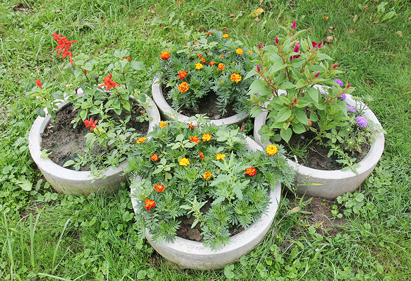 Бархатцы – это еще одно многоликое украшение участка. Они высеяны вдоль тротуара, по окружности у стволов деревьев, на каждом махоньком пятачке, где только можно.