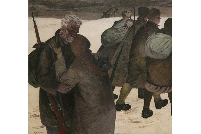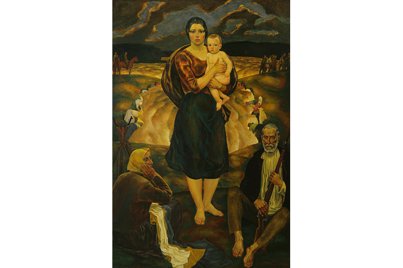 Главные герои его живописного полотна — поток женщин, детей, стариков, раненых воинов, покидающих родные места пешком; все, что они забрали с собой, несут за плечами в простынях или в сумках в руках. Партизаны за холмами идут в противоположном направлении, они защищают эту толпу. Общая композиция полотна — с высоты, очень высокая линия горизонта и ярко-красная полоса неба — зарево войны.