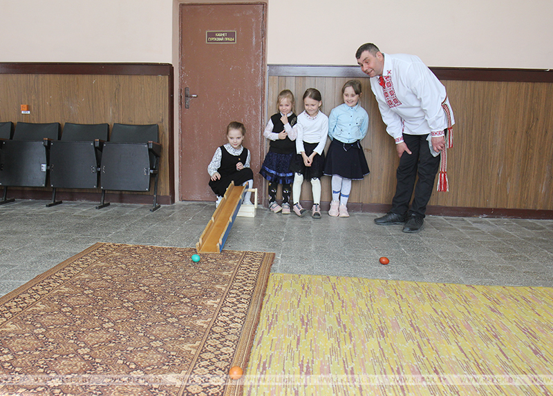 Сегодня в сельском клубе юные лазовичане изучали местные традиции празднования Пасхи, исполнили волочёбные песни, поучаствовали в пасхальных играх и освоили технику росписи яиц воском.