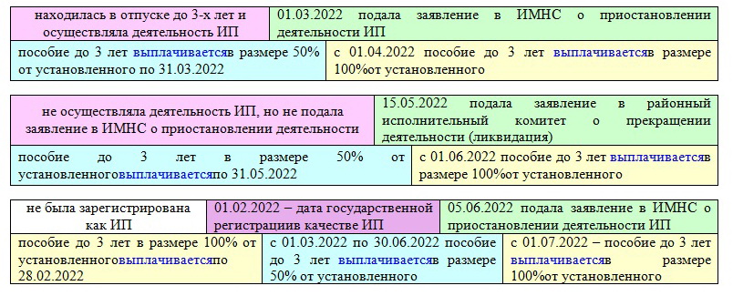 Пособие по уходу за ребенком в возрасте до 3 лет (далее – пособие до 3 лет) назначается и выплачивается в размере 50 процентов от установленного размера если получатель пособия до 3 лет, в том числе находящийся в отпуске по уходу за ребенком до достижения им возраста трех лет (далее – отпуск по уходу до 3 лет), является индивидуальным предпринимателем, нотариусом, адвокатом, лицом, осуществляющим ремесленную деятельность, деятельность в сфере агроэкотуризма (за исключением случаев приостановления соответствующей деятельности в установленном законодательством порядке или неосуществления предпринимательской деятельности в связи с нахождением в процессе прекращения деятельности).