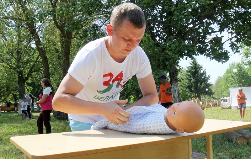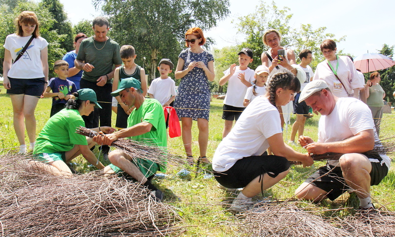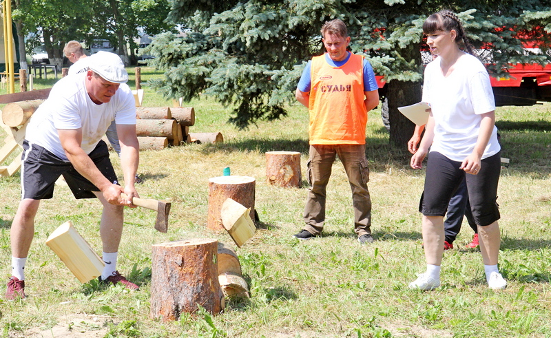 Семьи поучаствовали в конкурсах, где нужно было на время и без штрафных баллов распилить бревна, наколоть дрова, связать веники, запеленать куклу, с завязанными глазами собрать овощи.