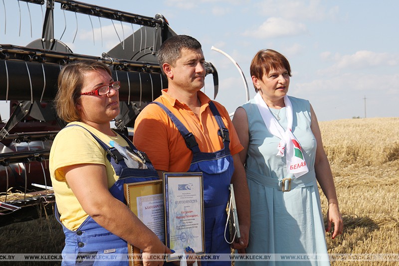 От имени Клецкой районной организации ОО «Белорусский союз женщин» тепло поздравила единственную женщину-помощника комбайнера в районе Надежду Костюкевич с трудовой победой Галина Кулага, с подарками приехала к лидерам жатвы и представитель районной организации «Белая Русь» Ольга Брановицкая.