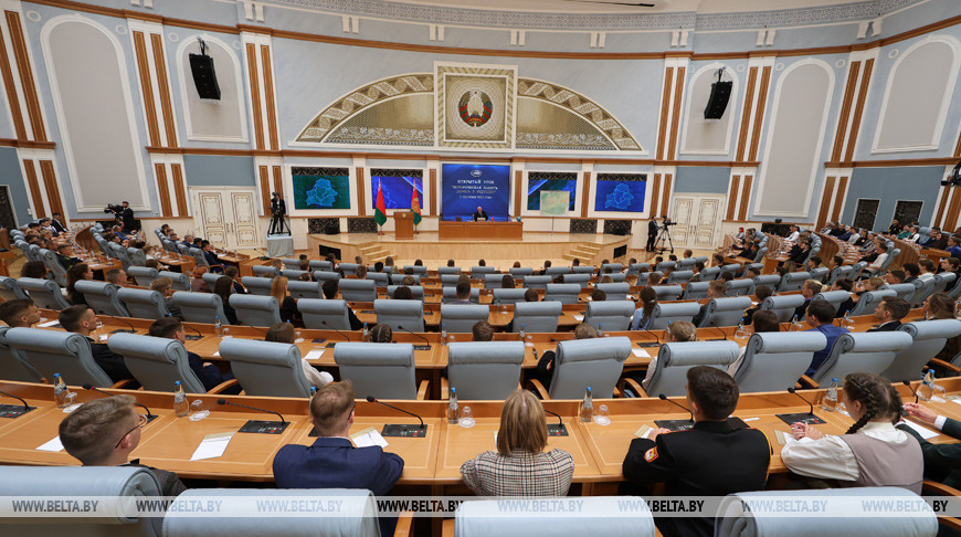 Президент Беларуси Александр Лукашенко в День знаний встретился со студентами вузов и учащимися учреждений общего среднего и среднего специального образования. Открытый урок “Историческая память – дорога в будущее” глава государства решил провести во Дворце Независимости, передает корреспондент БЕЛТА.