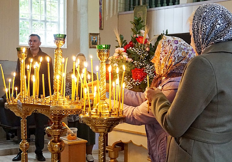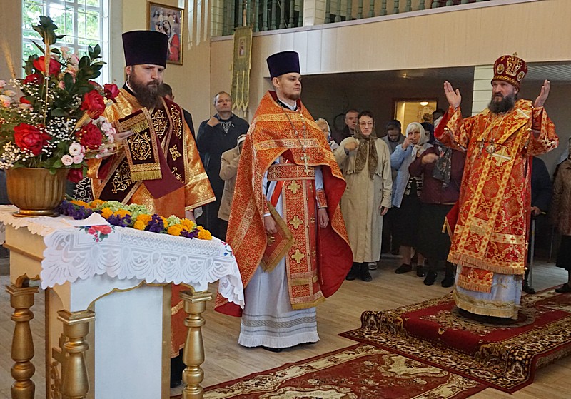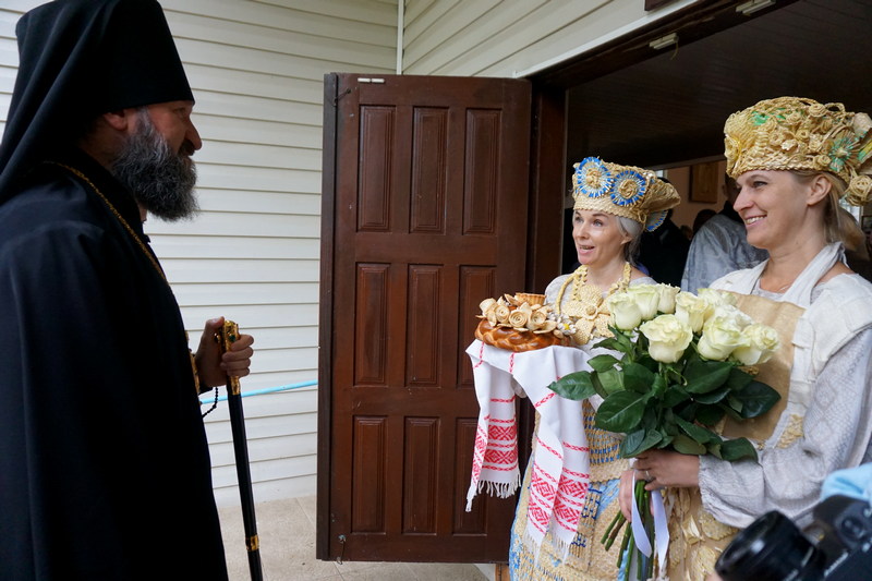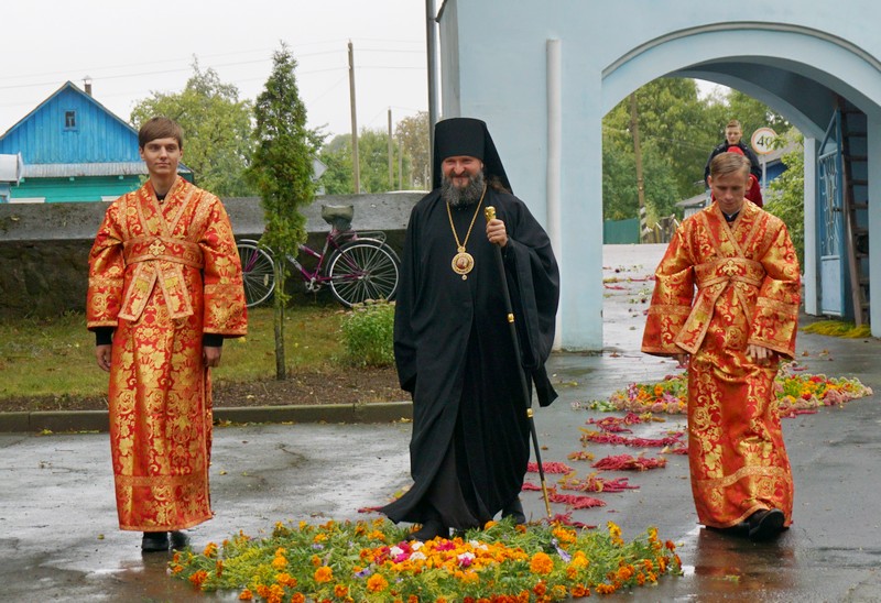 По традиции, его Преосвященство встречали прихожане церкви с караваем хлеба и букетами цветов, выложив цветочный ковер от калитки до церкви.