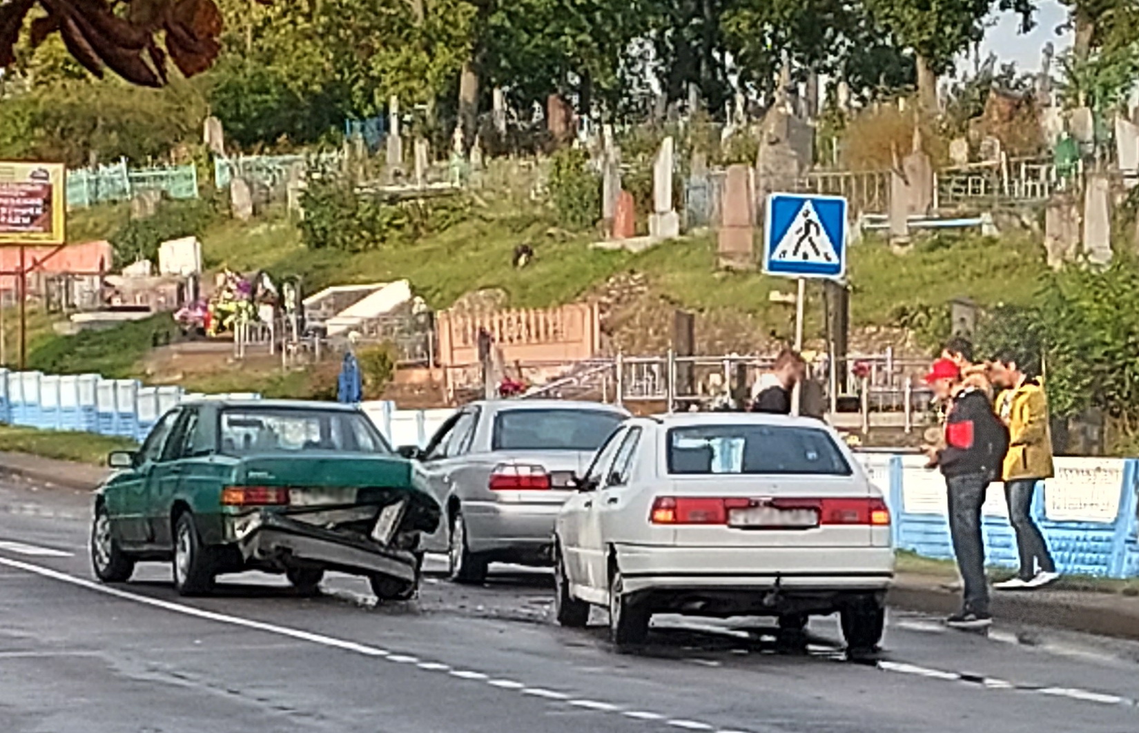 Возникло банальное происшествие, повторяющееся периодически: недавно прошел дождь, белое авто двигалось с превышением скорости, дистанция не соблюдалась. Чтобы избежать более серьезных последствий, водителю легковушки ничего не оставалось, как «поприветствовать» впереди остановившуюся машину неслабым ударом. Пешеход отделался легким испугом, а вот владельцам машин придется раскошелиться на ремонт.