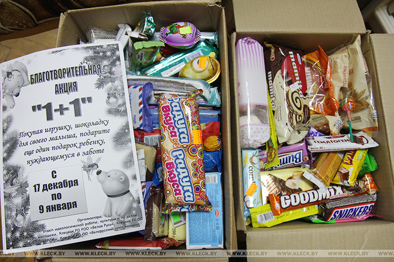 Акция “1+1” традиционно проводилась во всех магазинах УП “Клецкий коопзаготпром” в городе и районе. Тем, кто покупал своему ребенку игрушки или сладости, предлагали приобрести дополнительный товар, для благотворительных целей. Оставленные в мешке Деда Мороза гостинцы достались воспитанникам двух спецгрупп ГУО “Клецкий ясли-сад №2”.