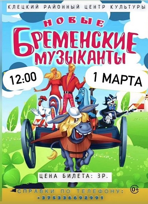 На сцене Клецкого районного центра культуры 1 марта покажут детский мюзикл. Постановку “Новые Бременские музыканты” создала та же творческая команда, что делала детские спектакли по мультфильмам “Щенячий патруль”, “Фиксики”, “Кунг-фу панда”, “Миньоны” и “Мадагаскар”.