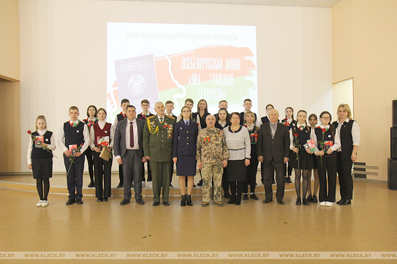 Игорь Иванович и Вероника Маслакова, помощник прокурора Клецкого района, передали восьмиклассникам паспорта и подарили Конституцию Беларуси.