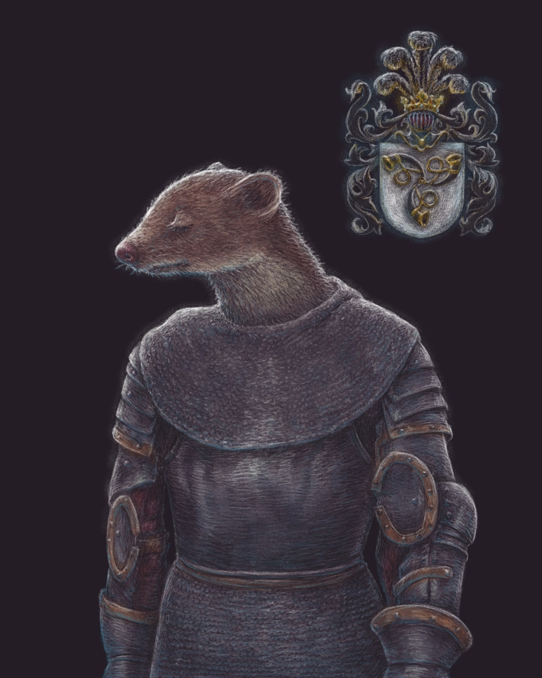 Механика их создания достаточно простая, я беру какое-то животное из белорусской фауны, дорисовываю ему средневековый доспех релевантный нашей географии, последнее время еще дорисовываю какой-нибудь шляхетский герб, который принадлежал нашей местной шляхте, и потом придумываю небольшую историю про этого оборотня.