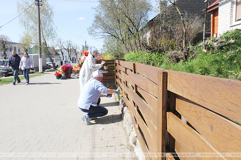Представители райисполкома, райбольницы и санстанции, местных филиалов банков и Белгосстраха вовсю орудовали кисточками, нанося свежую краску на деревянный забор по его периметру и скамейки.