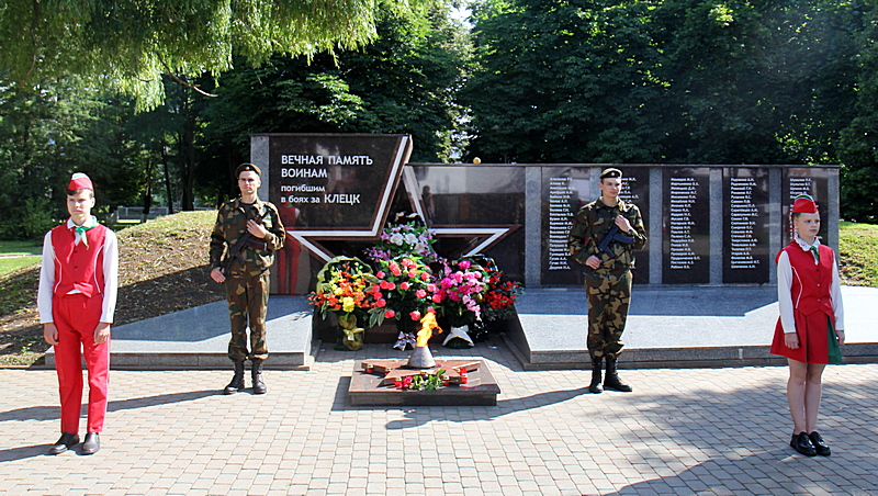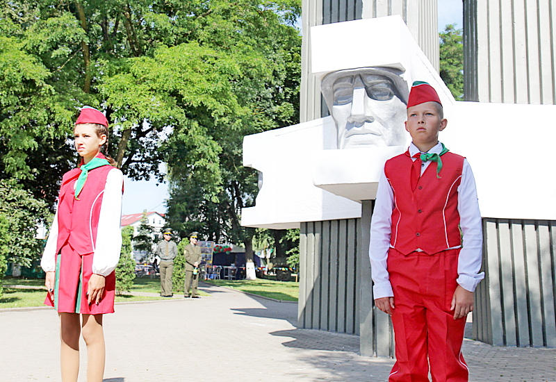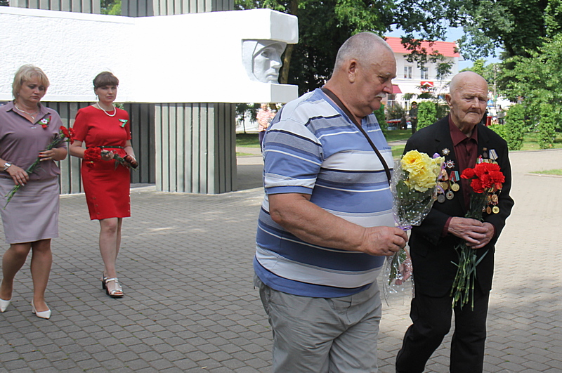 В возложении гирлянды славы, венков и живых цветов к подножию мемориала и Вечному огню в городском сквере приняли участие представители райисполкома, общественные объединения, трудовые коллективы, ветеран Великой Отечественной войны 97-летний Анатолий Лукьянович Куц, военнослужащие в/ч 54804 ВВС города Барановичи.