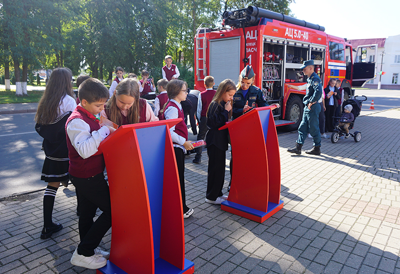 Учащимся городских школ и гимназии г.Клецка показали, какой спецтранспорт и оборудование используют в своей работе спасатели, госавтоинспекторы, газовики и медики.