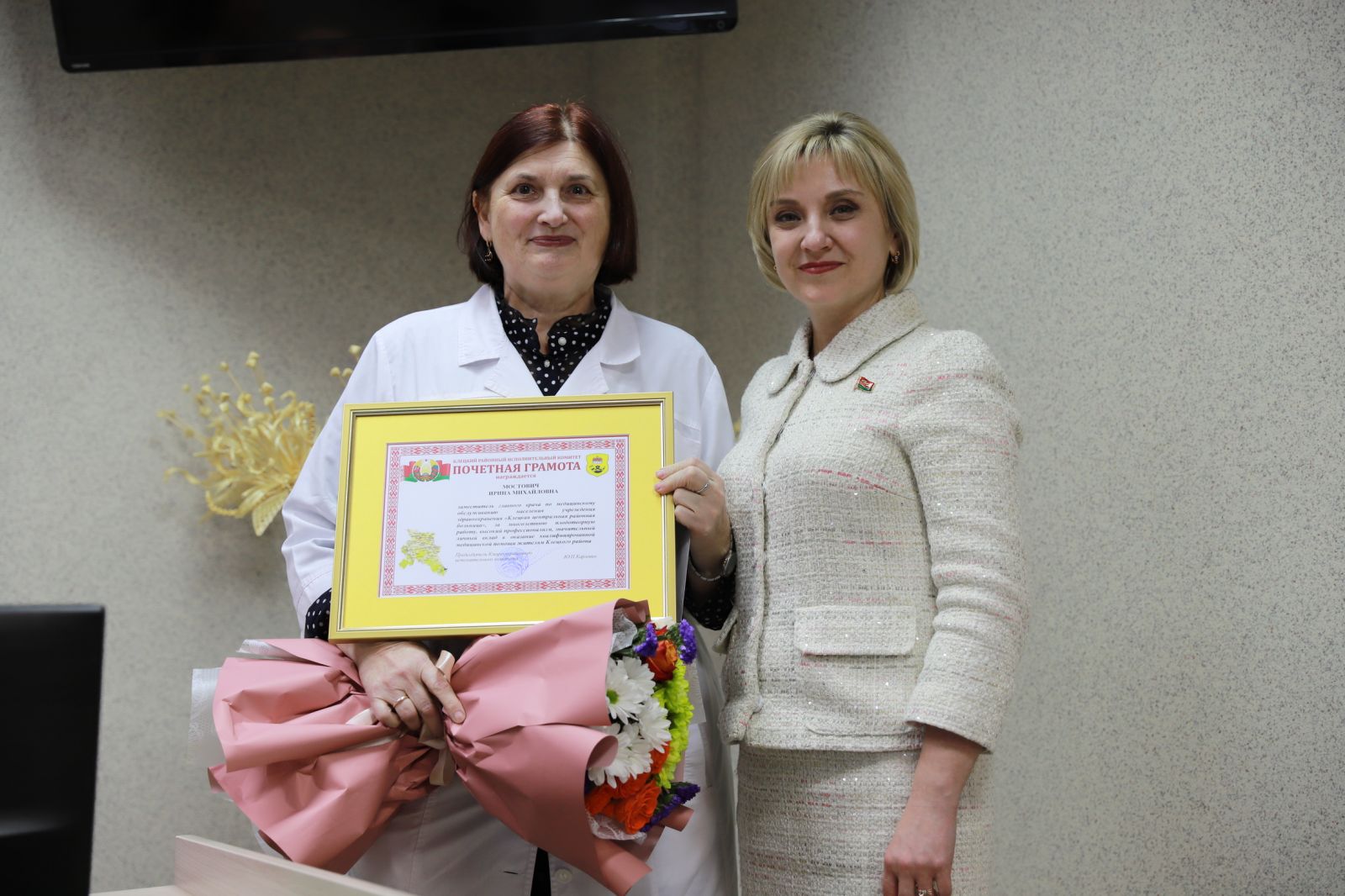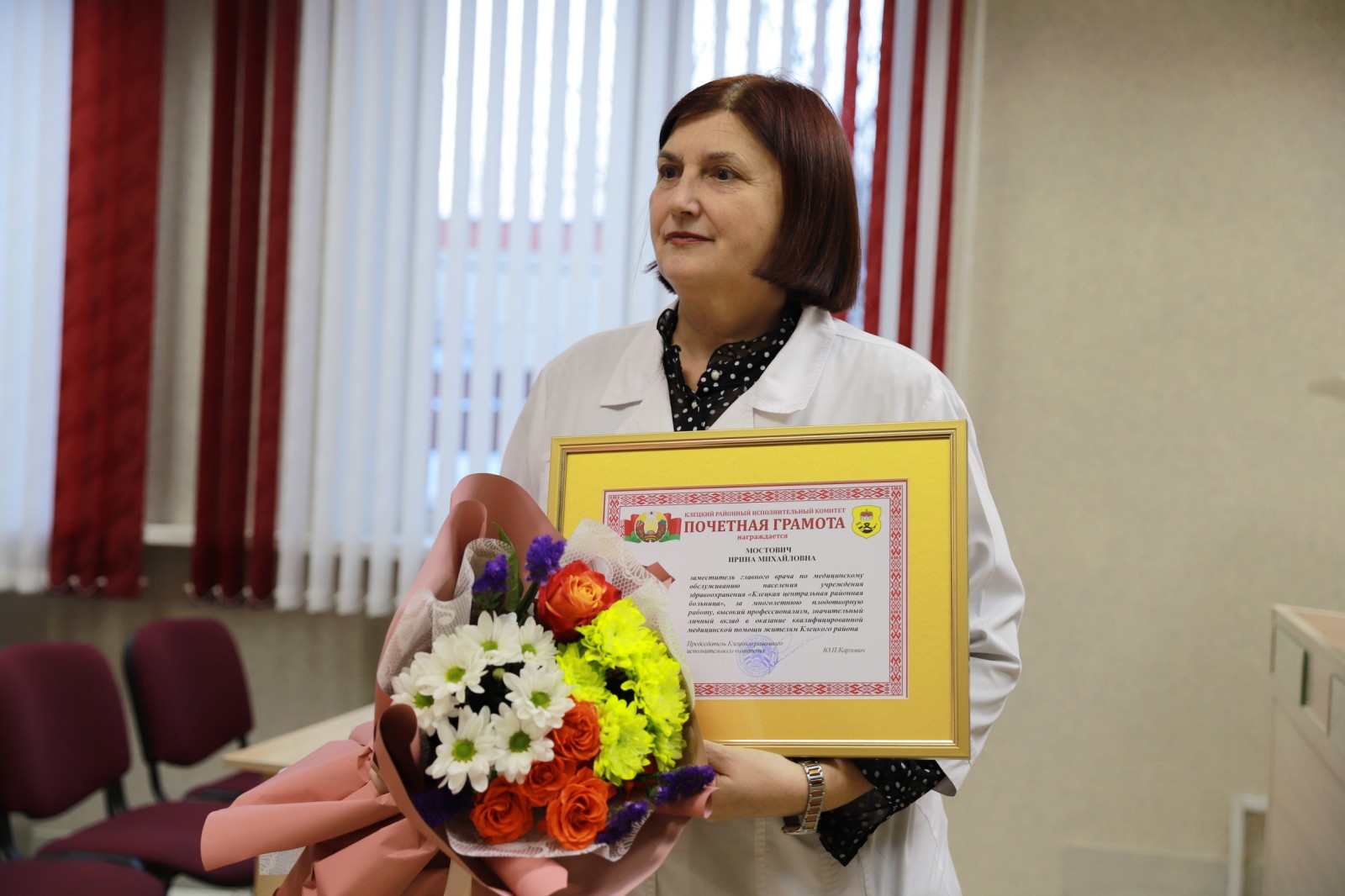 В конце встречи Алла Мелюк поблагодарила медицинских работников за их ежедневный напряженный труд и вручила высшую награду районного исполнительного комитета – Почетную грамоту – заместителю главного врача Клецкой ЦРБ Ирине Мостович за многолетнюю плодотворную работу, высокий профессионализм и большой личный вклад в оказание высококвалифицированной помощи жителям Клецкого района.
