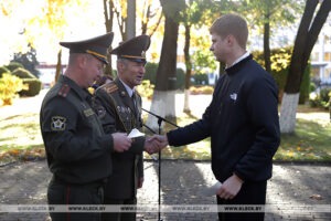 Сергей Зыков в знак благодарности за поддержку проекта вручил символическую медаль Алле Мелюк, заместителю председателя Клецкого райисполкома