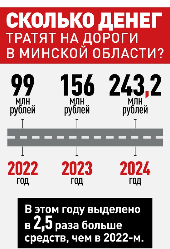 Дорожная сеть. Я говорю только о местных дорогах. В 2022-м было выделено около 100 миллионов рублей. В 2023-м — более 150, а в этом году — 243 миллиона. То есть по сравнению с 2022 годом объем денежных средств вырос в два с половиной раза. Мы понимаем, что, наверное, все проблемы мы не решим, но существенно сократим их количество.