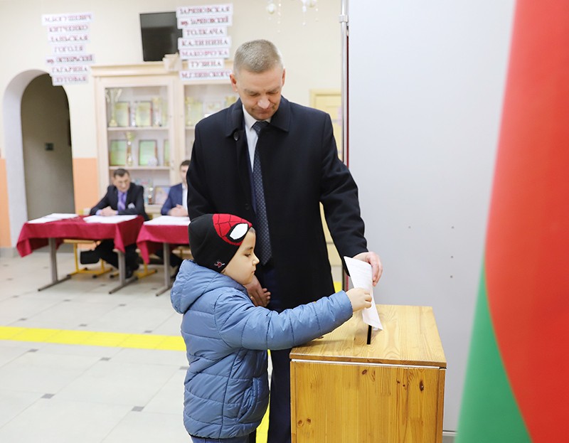 [caption id="attachment_94822" align="aligncenter" width="800"] Юрий Карлович пришёл на избирательный участок с младшим из троих…