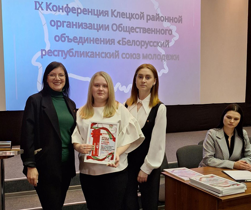 Приятной частью конференции стало награждение. Активистам районной организации объявили Благодарность Клецкой РО ОО «БРСМ» и вручили сертификаты. На сцену выходили Дарья Калейник, ведущий юрисконсульт ОАО «Гамма вкуса», Мария Курлович, заместитель директора по воспитательной работе Заостровечской СШ, Любовь Ромашко, учитель истории и обществоведения Грицевичской СШ, Вероника Салихова, инженер-технолог Клецкого ППЗ, Анастасия Сидорович, заместитель директора по воспитательной работе гимназии г.Клецка, Елена Тимовец, главный специалист отдела идеологической работы, культуры и по делам молодежи Клецкого райисполкома, Виолетта Шейко, учитель физической культуры и здоровья Клецкой СШ №3, Елизавета Ярошевич, учитель английского языка Рассветовской СШ. Удостоена награды была также самая активная семья Кристины и Бориса Милишкевич.