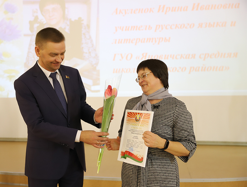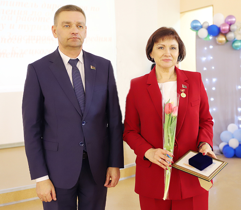 Юрий Петрович провел церемонию награждения. Нагрудным знаком «Отличник образования Республики Беларусь» за высокий профессионализм, успешное выполнение образовательных задач награждена заместитель начальника управления по образованию, спорту и туризму Светлана Стадник.
