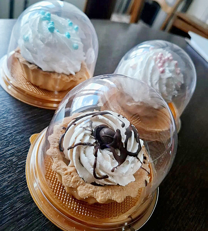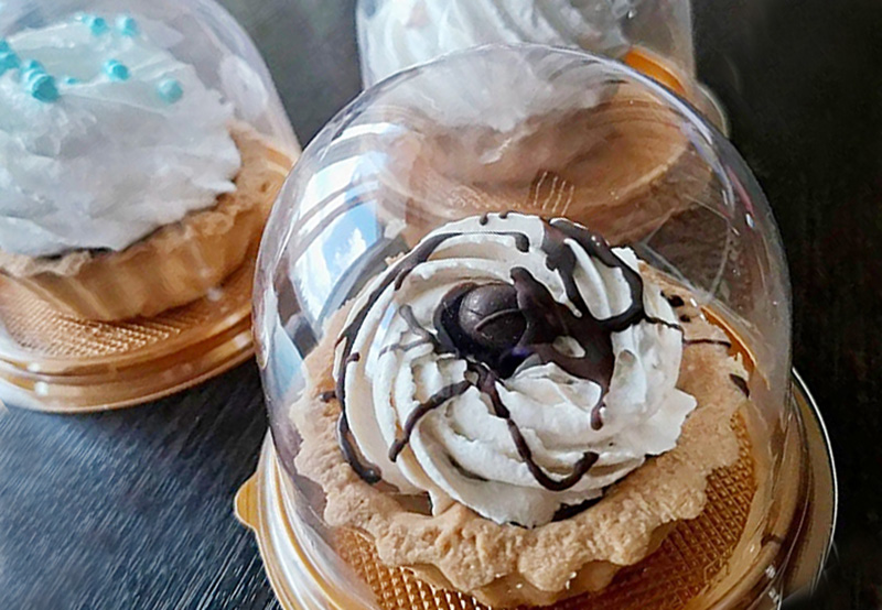 В корзиночке “Кофейный аромат” использован крем на основе растительных сливок с добавлением кондитерской начинки со вкусом капучино. Начинка этого пирожного – десерт “Мягкая карамель с солью”. Украшено изделие шоколадной глазурью и глазурью “Кофейные зерна”.