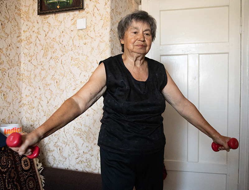 По совету специалиста Надежда Ивановна старается как можно больше двигаться. Каждый день утром и вечером она делает физическую зарядку с гантелями, эспандерами, утяжелителями для ног. Регулярно занимается пешими прогулками и ходьбой со скандинавскими палками. Она знает: чтобы мышцы тела работали, нужно постоянно работать самой.