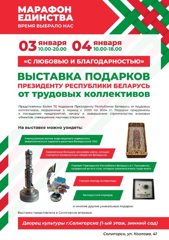 Выставка включает более 70 подарков, преподнесенных Президенту Республики Беларусь с 2000 по 2024 гг. Это лишь малая часть. Экспозиция включает картины, сувениры, модели техники, производимой для нужд нашей страны, результаты научных открытий. Среди главных экспонатов, которые должны особо понравиться жителям города, – подарки от коллектива Беларуськалия: скульптура шахтера, сертификат, врученный А.Лукашенко по факту посещения шахты 4 РУ в 2006 г., сувенир с официальной церемонии ввода в эксплуатацию Петриковского ГОКа.