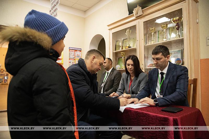 Юрий Петрович, председатель Клецкого районного исполнительного комитета, прибыл на Гагаринский участок для голосования №2 вместе с младшим сыном – первоклассником Тимофеем.