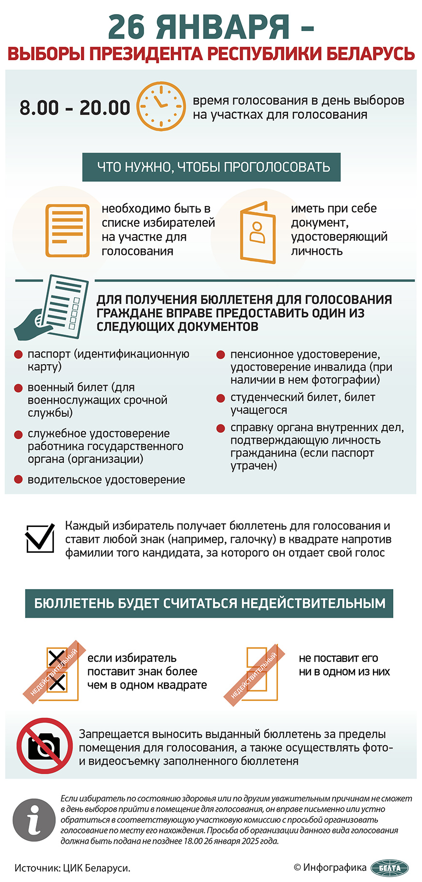 На территории страны образовано 5325 участков для голосования. Они будут работать сегодня с 8.00 до 20.00. Избиратели, включенные в списки, смогут получить бюллетень для голосования при предъявлении паспорта (ID-карты). Кроме того, можно предоставить и другой документ, который подтверждает личность, – водительское удостоверение, удостоверение инвалида (если в нем есть фото) или пенсионное удостоверение. Для военнослужащих срочной службы предусмотрено предоставление военного билета, для работников государственных органов и организаций – служебного удостоверения. Если гражданин утерял паспорт (ID-карту) или их похитили, то органы внутренних дел выдают соответствующие справки, которые подтверждают личность. Молодежь может проголосовать по студенческому билету или билету учащегося.