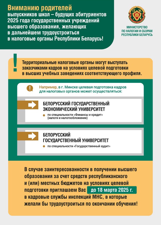 Абитуриентов приглашают пройти целевую подготовку для налоговых органов Общество ДНП 06.03.2025 0 Комментарии МНС Беларуси приглашает абитуриентов на целевую подготовку кадров для налоговых органов.
