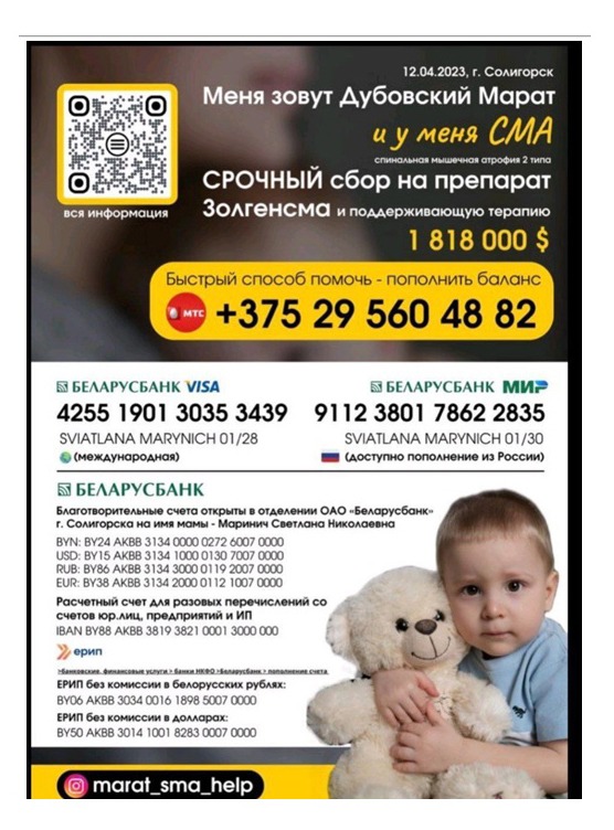 В Беларуси открыт срочный сбор средств на спасительный укол для Марата. Цена препарата Zolgensma– 1.818.000$.
