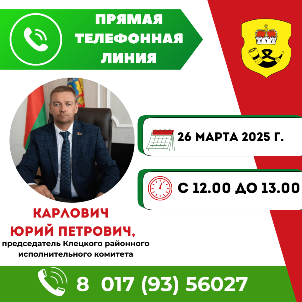 26 марта 2025 года состоится «прямая телефонная линия» с председателем Клецкого районного исполнительного комитета Карловичем Юрием Петровичем. По номеру 56 0 27 жители района могут задать волнующие их вопросы с 12.00 до 13.00.