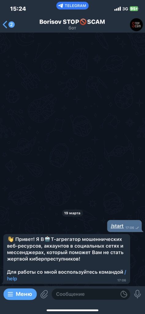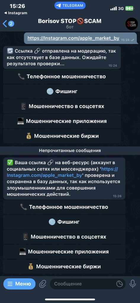 Сотрудниками отделения по противодействию киберпреступности был разработан телеграмм бот “Borisov STOP SCAM”. При помощи данного бота можно узнать, является ли аккаунт магазина в сети Инстаграм настоящим или же мошенническим.