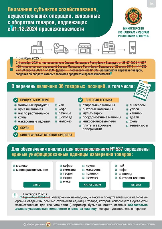 «Об изменении постановлений Совета Министров Республики Беларусь» с 1 октября 2025 г. безалкогольные напитки, соки, мобильные телефоны и ноутбуки исключаются из перечня товаров, подлежащих маркировке унифицированными контрольными знаками, и подлежат маркировке средствами идентификации (включаются в перечень товаров, подлежащих маркировке средствами идентификации).