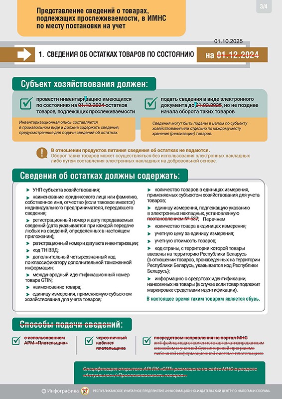 Важно! С даты введения маркировки товаров хранение остатков товаров без маркировки средствами идентификации разрешается до 01.02.2026, при наличии в месте хранения инвентаризационной описи либо ее копии, заверенной субъектом хозяйствования, осуществляющим производство, оптовую и (или) розничную торговлю такими товарами, и при условии передачи в систему маркировки сведений о проведении инвентаризации. При этом реализация немаркированных средствами идентификации остатков, в том числе с нанесенными на них унифицированными контрольными знаками запрещена.