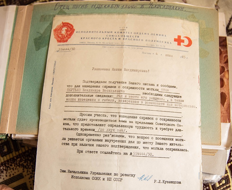 –Я нарадзілася 28 мая 1944 года. Толькі мяне пахрысцілі, бацьку адразу ж у чэрвені забралі на вайну – прызвалі разам з аднавяскоўцамі, – пачала гутарку субяседніца. – Яму было 30 гадоў. Пазней бацькаў сябра з Грыцэвічаў нам расказваў, што яны дайшлі фронтам да Чэхаславакіі і пад вёскай Бочкава 11 снежня 1944 года яго напаткала варожая куля. Там жа яго пахаваў аднакашнік і ўстанавіў таблічку з надпісам прозвішча загінуўшага – Уладзімір Васільевіч Шкуцька.