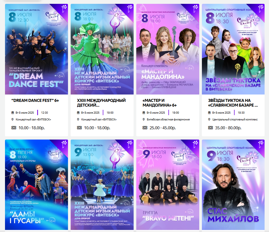 Афиша мероприятий “Славянского базара в Витебске”: https://fest-sbv.gck.by/afisha/