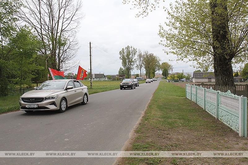 Сначала большая колонна автомобилей под государственными флагами отправилась по маршруту патриотического автопробега. На ее пути лежали три агрогородка – Домоткановичи, Орда и Щепичи.