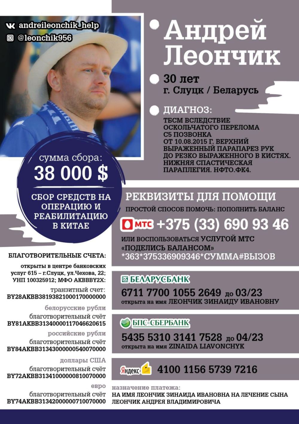 Два месяца после операции Андрей провел в реанимации, после чего его перевели в отделение травматологии. После выписки – реабилитация в Аксаковщине, а затем новая операция и реабилитация. Андрей очень хочет победить свою беду, старательно занимается на специальных тренажерах, но этого недостаточно, нужно специальное лечение, практикуемое за рубежом. Ему готовы помочь в одной из клиник Китая. Есть большая надежда, что Андрей будет ходить. Операция заключается в пересадке стволовых клеток в спинной мозг для восстановления чувствительности двигательных функций. Счет из клиники – 38000 долларов.